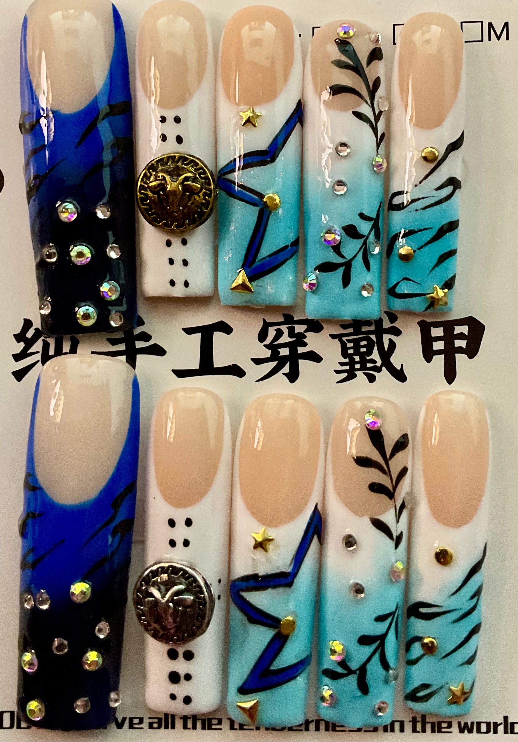 Add some sparkle to your look with the Celestial Garden Press On Nails featuring dazzling blue and white gradient rhinestone stars. Accented with sleek black tips, these nails bring a playful twist to your style—perfect for those who love a bit of cosmic charm with an edge. Easy to apply and designed to shine, they’re your go-to for instantly glam hands.