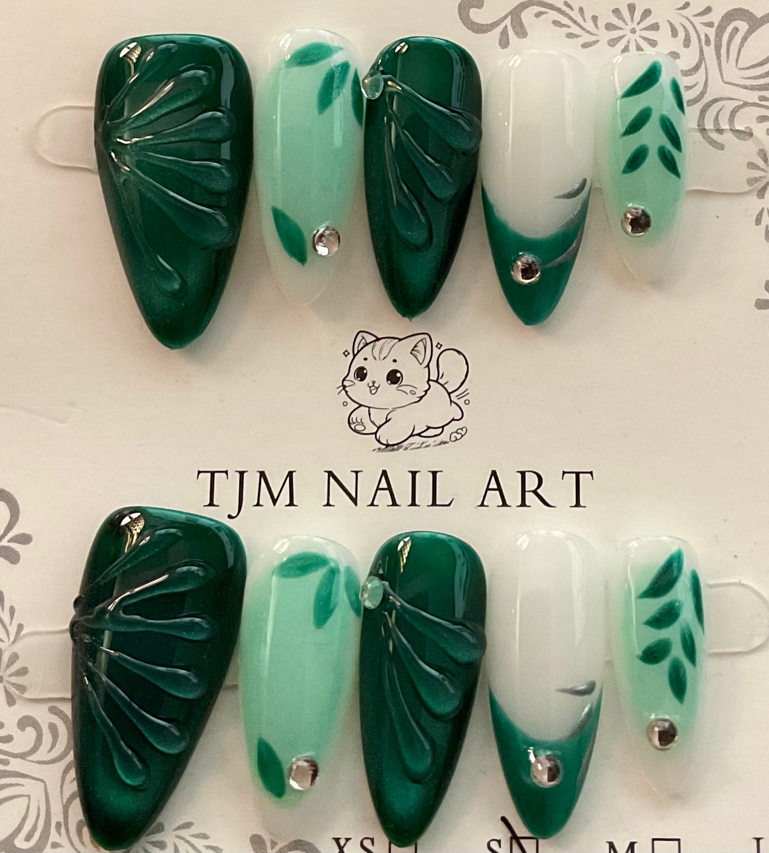 Bring a touch of nature to your fingertips with these playful Emerald Leaf Rhinestone Press On Nails. Rich green hues and delicate leaf patterns create a fresh, lively look, while tiny rhinestones add just the right sparkle for fun and flair. Easy to wear and ready to brighten any day!