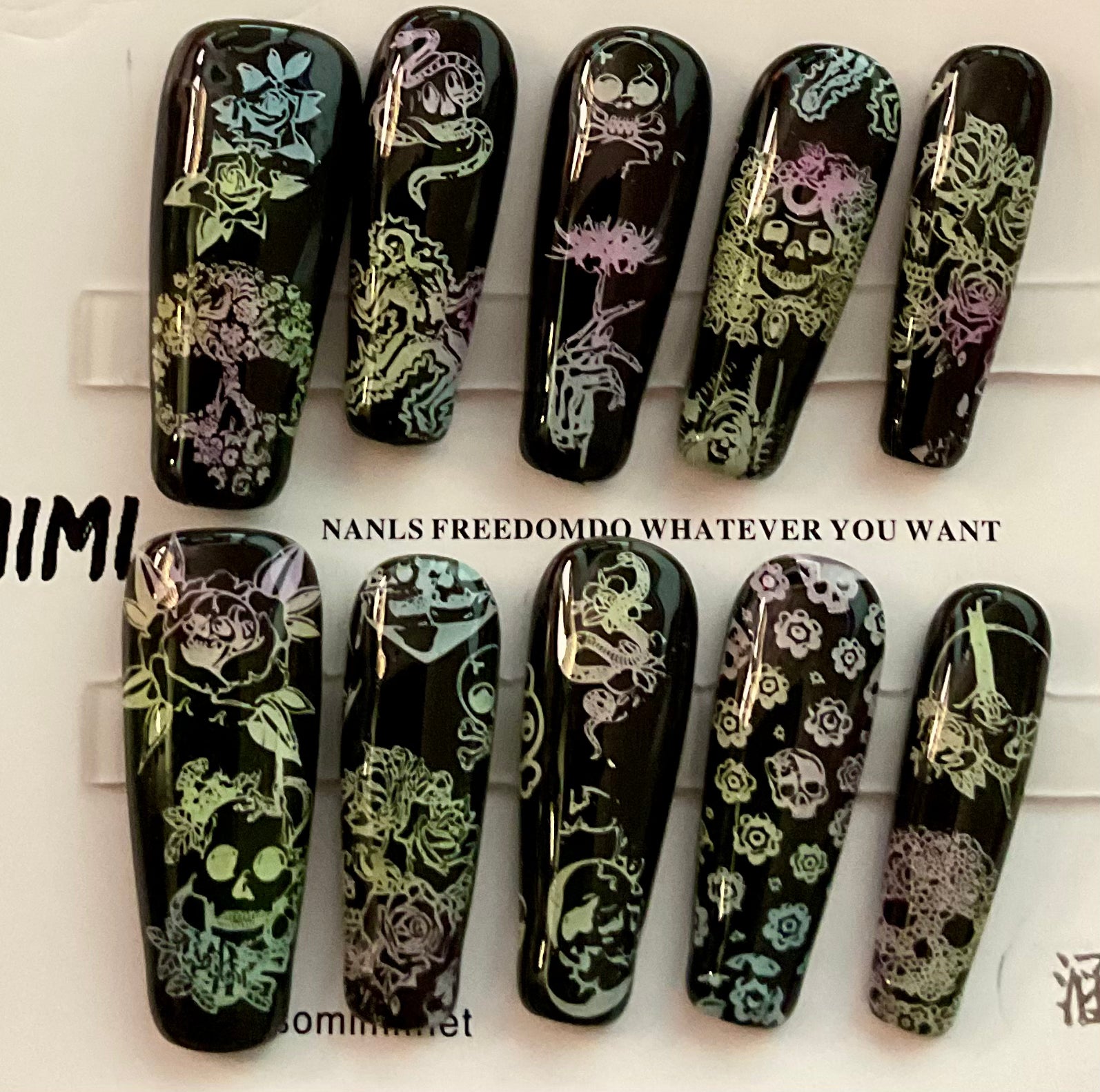 Give your nails a darkly dazzling makeover with these Gothic Holographic Skull Press On Nails. Featuring spooky skull designs with a mesmerizing holographic shine, they add a playful edge to any look. Easy to apply and eyes-catching, they’re perfect for standing out at parties or spicing up your everyday style with a bit of gothic glam.
