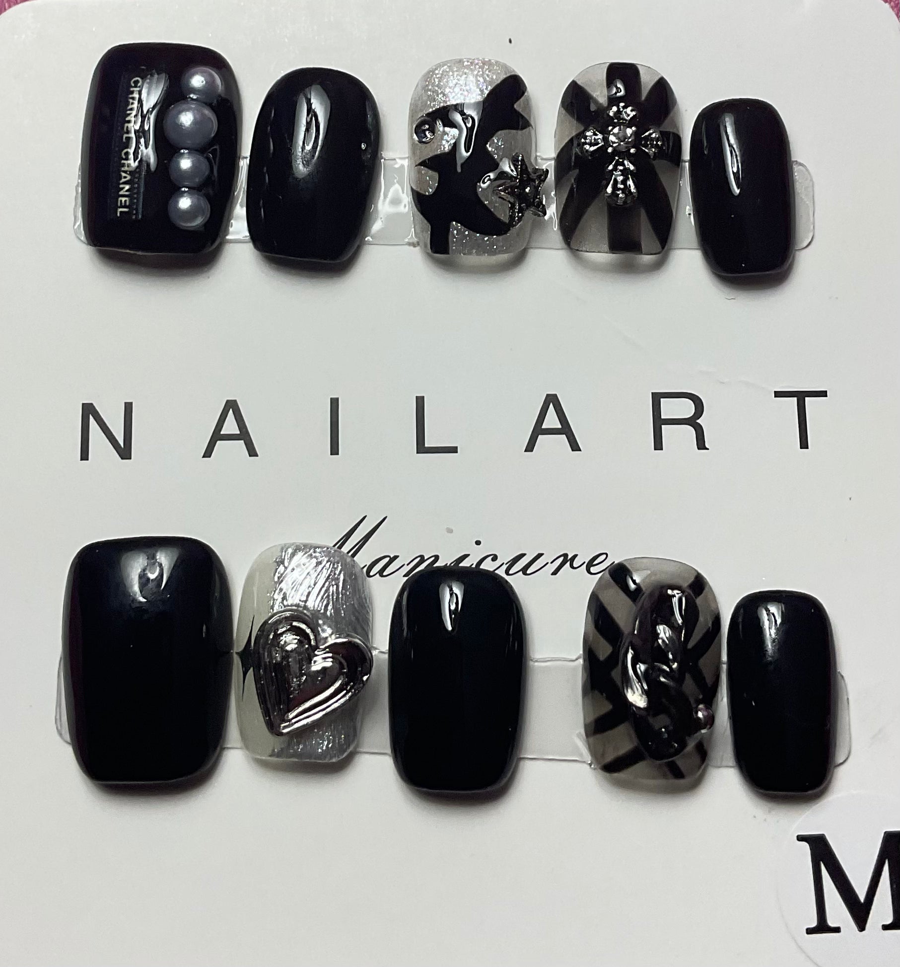 Add a touch of chic flair to your look with these Midnight Glamour Press On Nails. Featuring bold black nails adorned with a striking big bow and the iconic word Chanel, they bring playful elegance to your fingertips. Perfect for turning heads and elevating any outfit in an instant!
