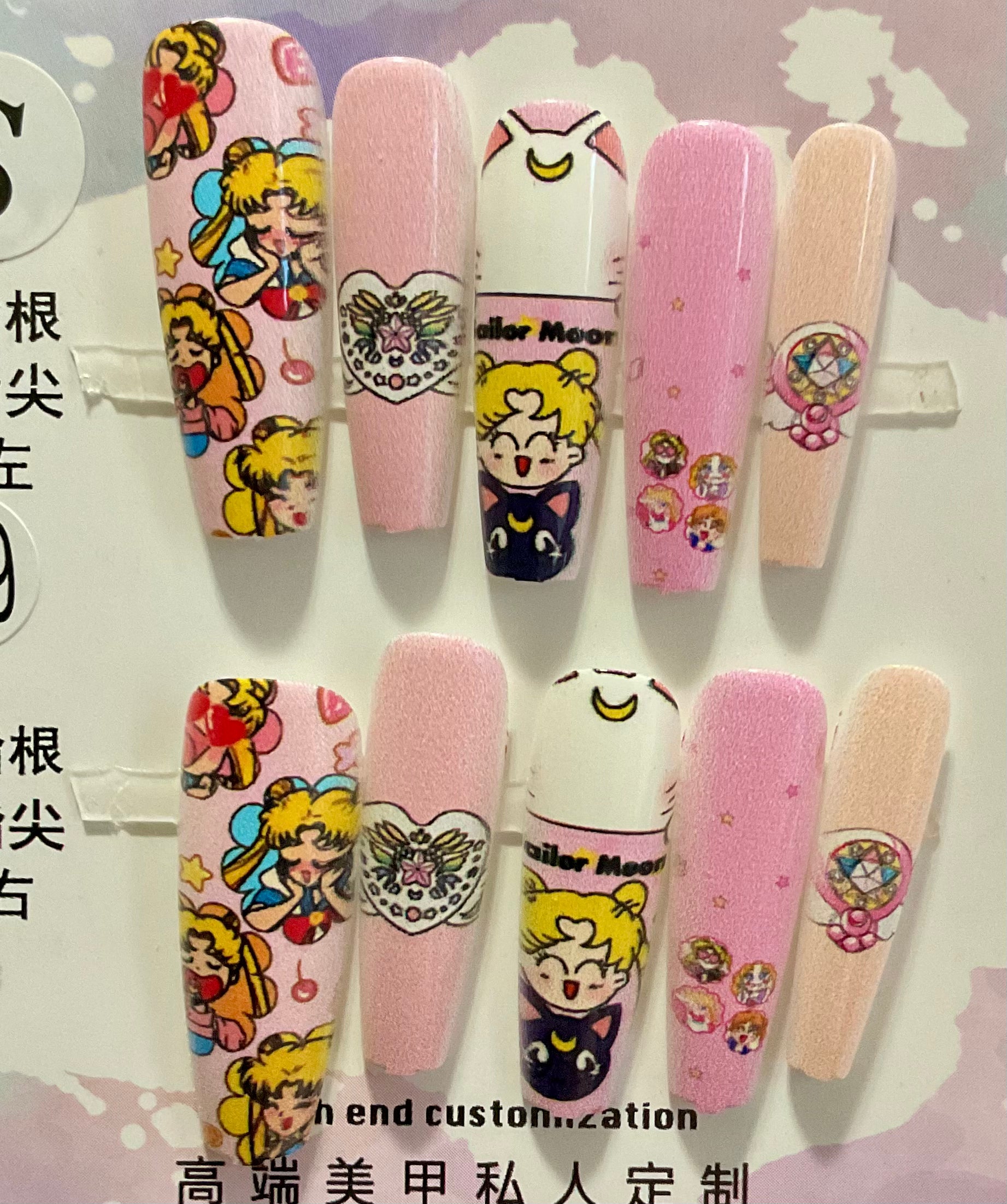 Transform your fingertips into a magical tribute with these enchanting Sailor Moon press-on nails! Each nail features iconic imagery from the beloved series, bringing a touch of celestial charm to your everyday look. Perfect for fans who want to channel their inner Sailor Scout, these ready-to-wear nails offer instant glamour without the salon visit. Whether you're attending a convention, cosplay event, or just want to celebrate your love for the series, these nails deliver instant magical girl energy. Easy to apply and remove, they're your ticket to looking absolutely stellar!